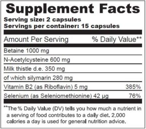 Betaine, N-Acetylcysteine, bulking agents: cellulose, tricalcium phosphate; milk thistle (Silybum marianum (L.) Gaertn., fruit) dry extract titrated to 80% silymarin, anti-caking agents: fatty acids, silicon dioxide, magnesium salts of fatty acids; L-selenomethionine, riboflavin (vitamin B2).