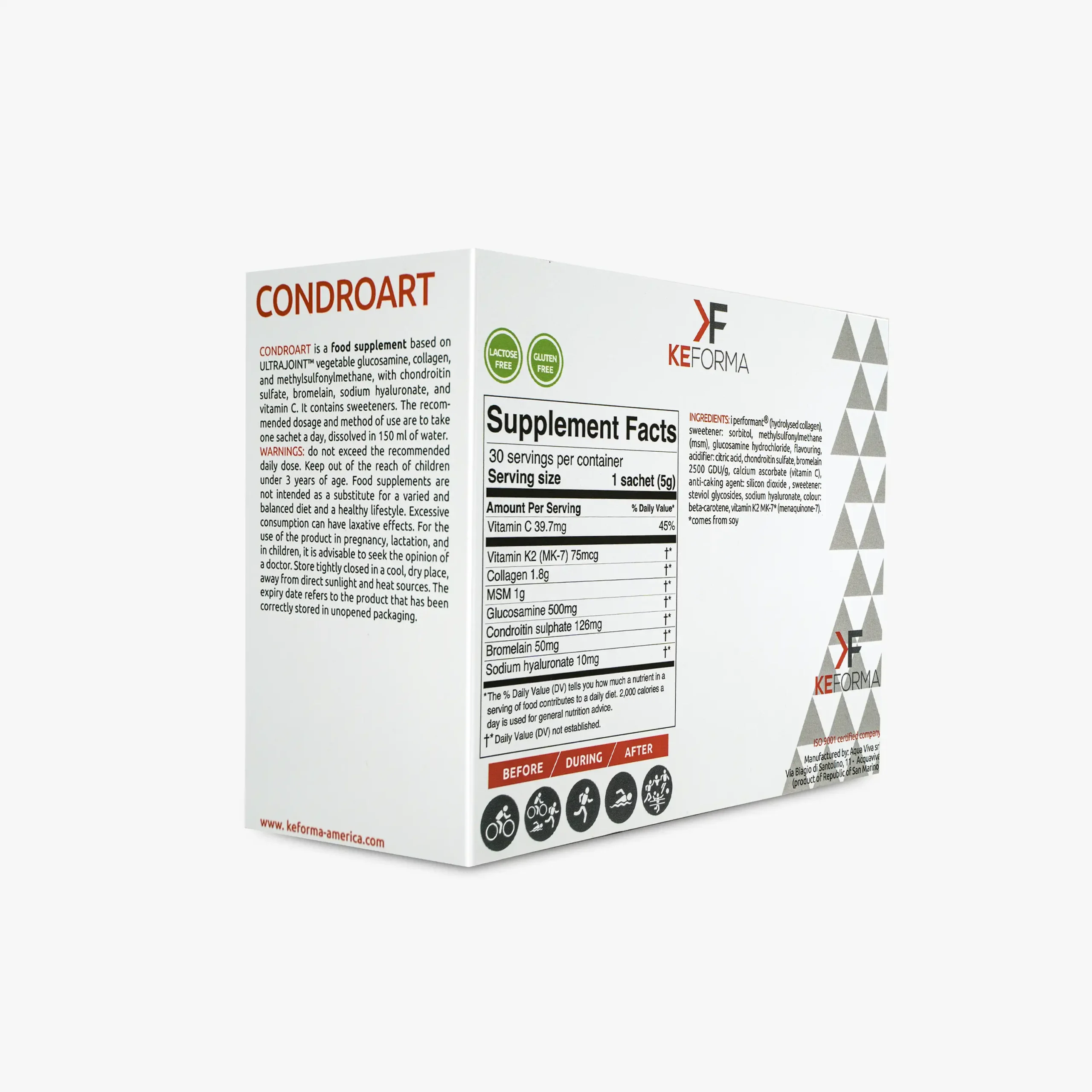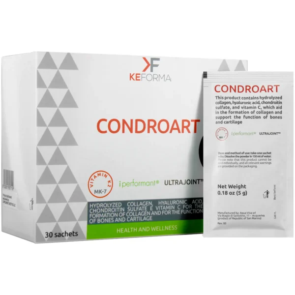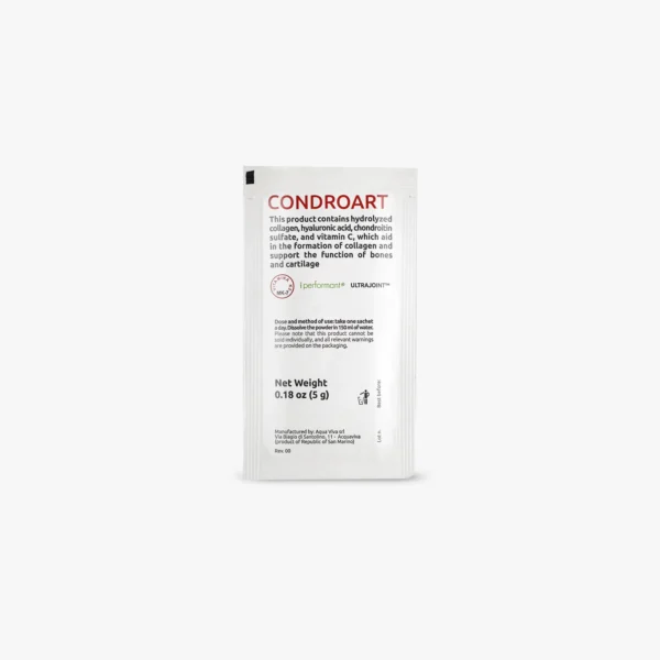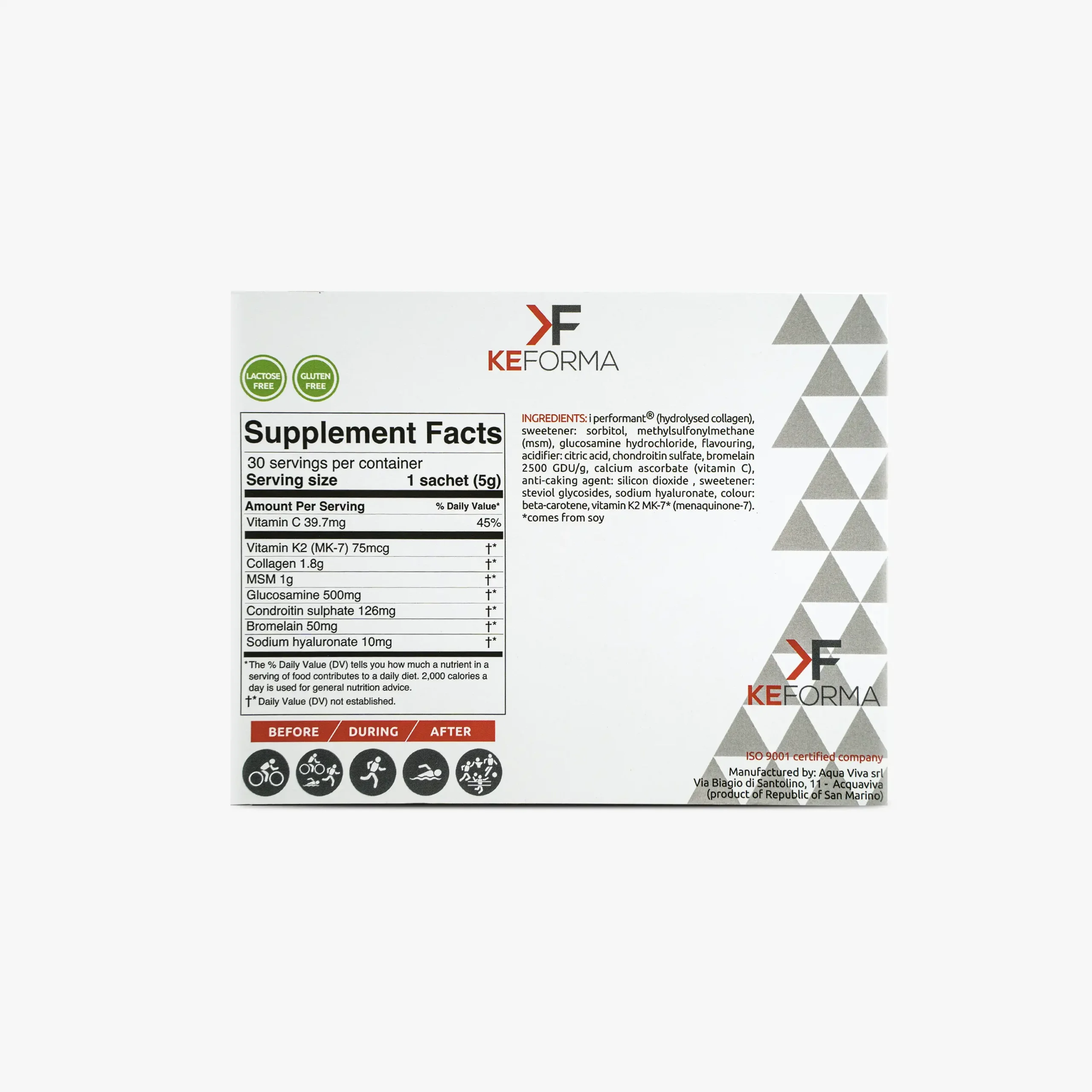 i Performant® (hydrolyzed collagen), sweetener: sorbitol, methylsulfonylmethane (MSM), glucosamine hydrochloride, flavor, acidifier: citric acid, chondroitin sulfate, bromelain 2500 GDU/g, calcium ascorbate (vitamin C), antiplatelet agent: silicon dioxide, sweetener: steviol glycosides, sodium hyaluronate, coloring agent: beta-carotene, vitamin K2 MK-7* (menaquinone-7).