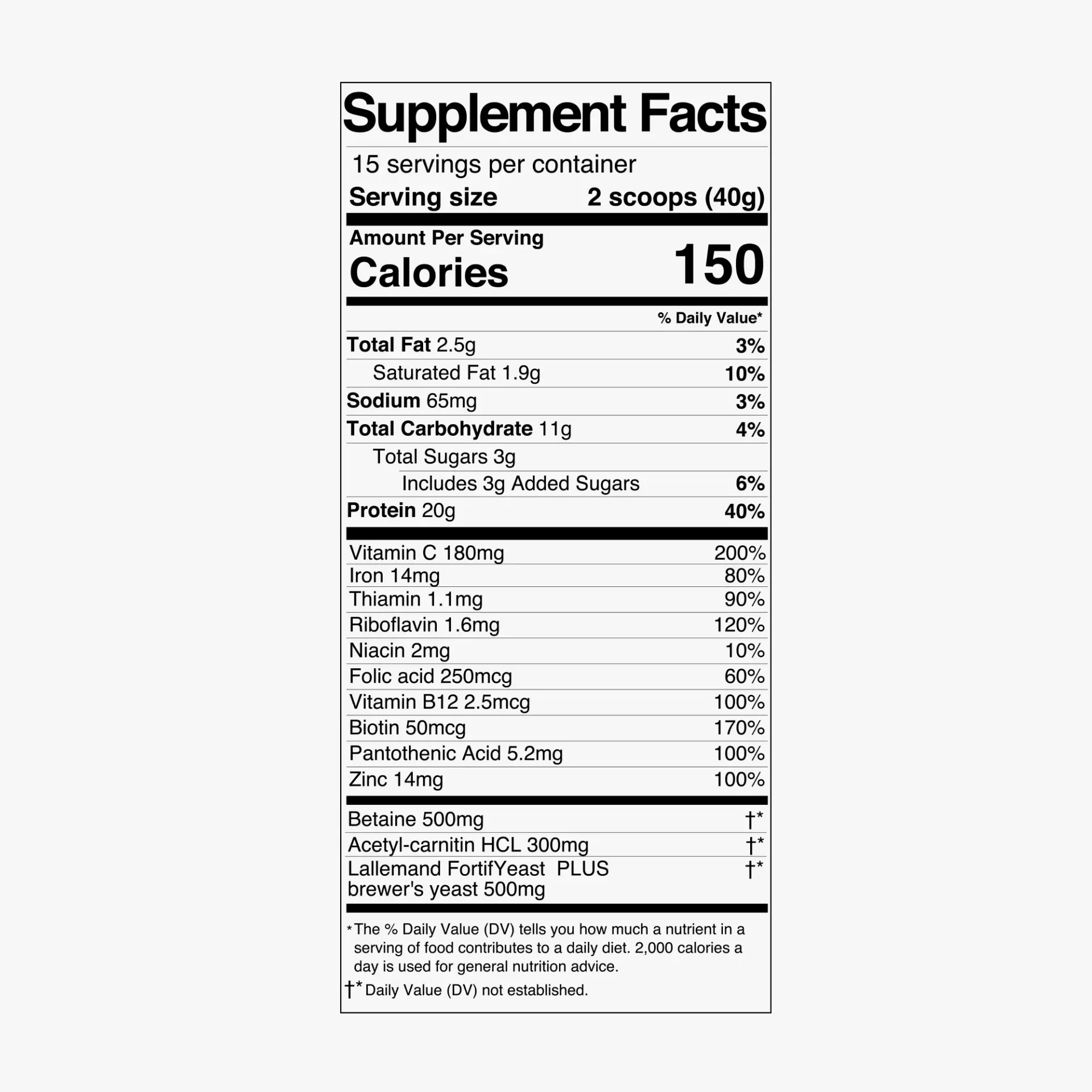 Concentrated whey protein (contains emulsifier: soy lecithin), maltodextrin, yogurt powder (contains milk), cocoa powder, flavor, betaine, Lallemand FortifYeast™ PLUS Brewer’s yeast (Saccharomyces cerevisiae) powder, thickener: carboxymethyl cellulose, acetyl L-carnitine hydrochloride, anti-caking agent: silicon dioxide, L-ascorbic acid (vitamin C), Lipofer® (corn starch, iron pyrophosphate, emulsifier: sunflower lecithin), sweetener: sucralose, zinc gluconate.