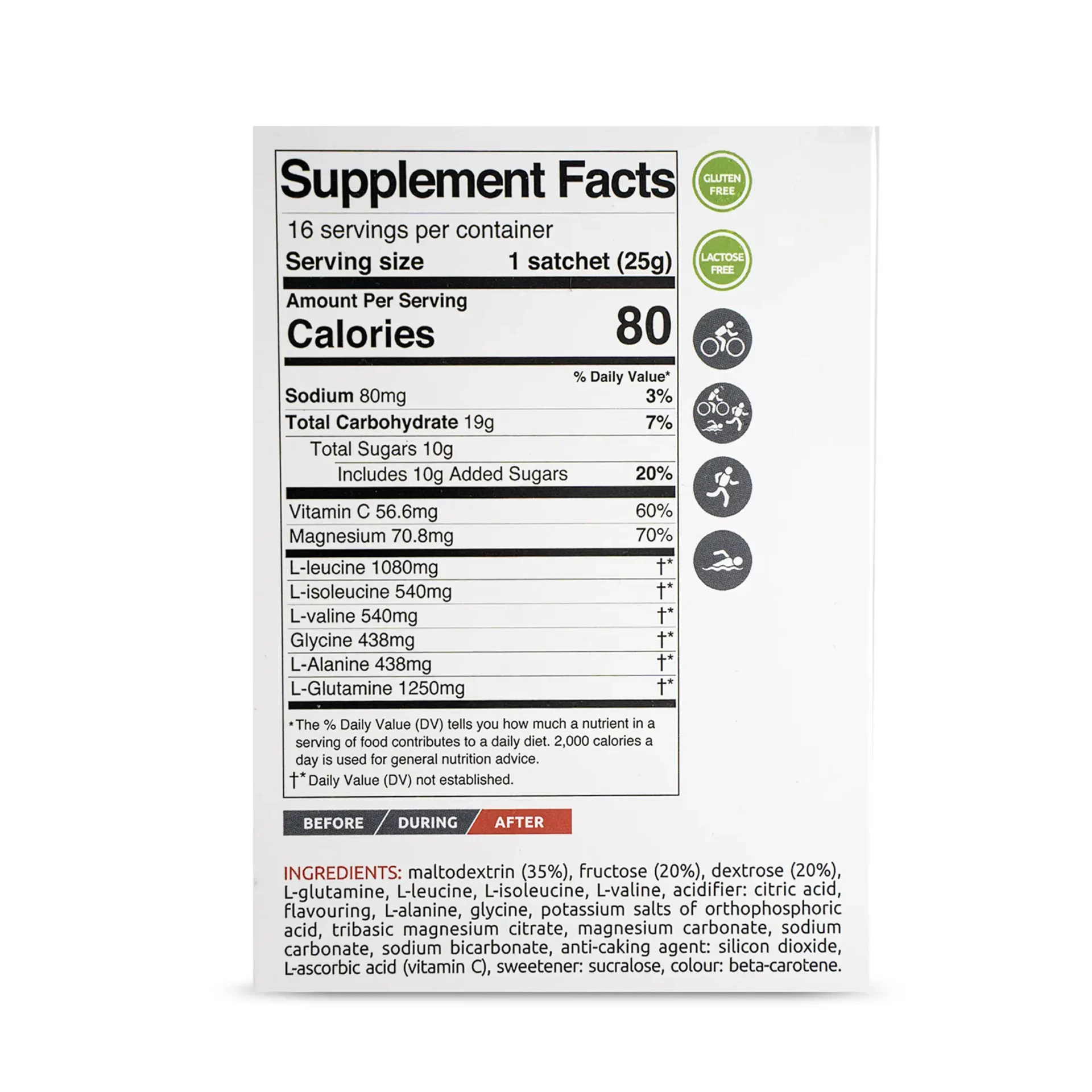 Maltodextrin (35%), fructose (20%), dextrose (20%), L-glutamine, L-leucine, L-isoleucine, L-valine, acidifier: citric acid, flavor, L-alanine, glycine, potassium salts of orthophosphoric acid, tribasic magnesium citrate, magnesium carbonate, sodium carbonate, sodium bicarbonate, anti-caking agent: silicon dioxide, L-ascorbic acid (vitamin C), sweetener: sucralose, coloring: beta-carotene.