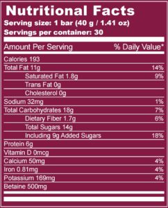 Dried fruit (almonds, hazelnuts) (41%); honey, sucrose, raisins (7%), peanuts, sesame seeds, sweeteners: maltitol, isomalt; egg white, betaine, Salt, flavorings, emulsifier: soy lecithin. Allergens: see ingredients in bold. It may contain other nuts.