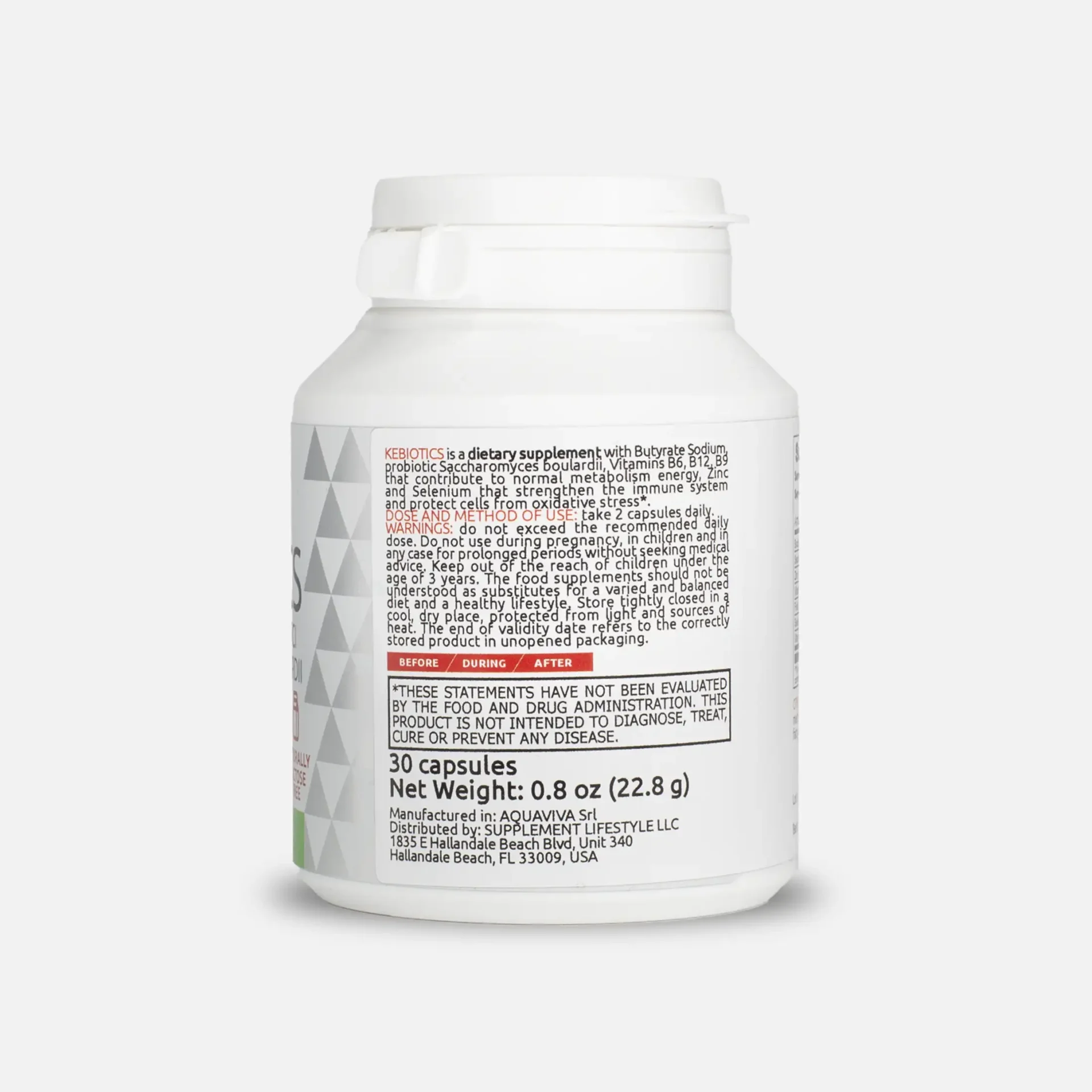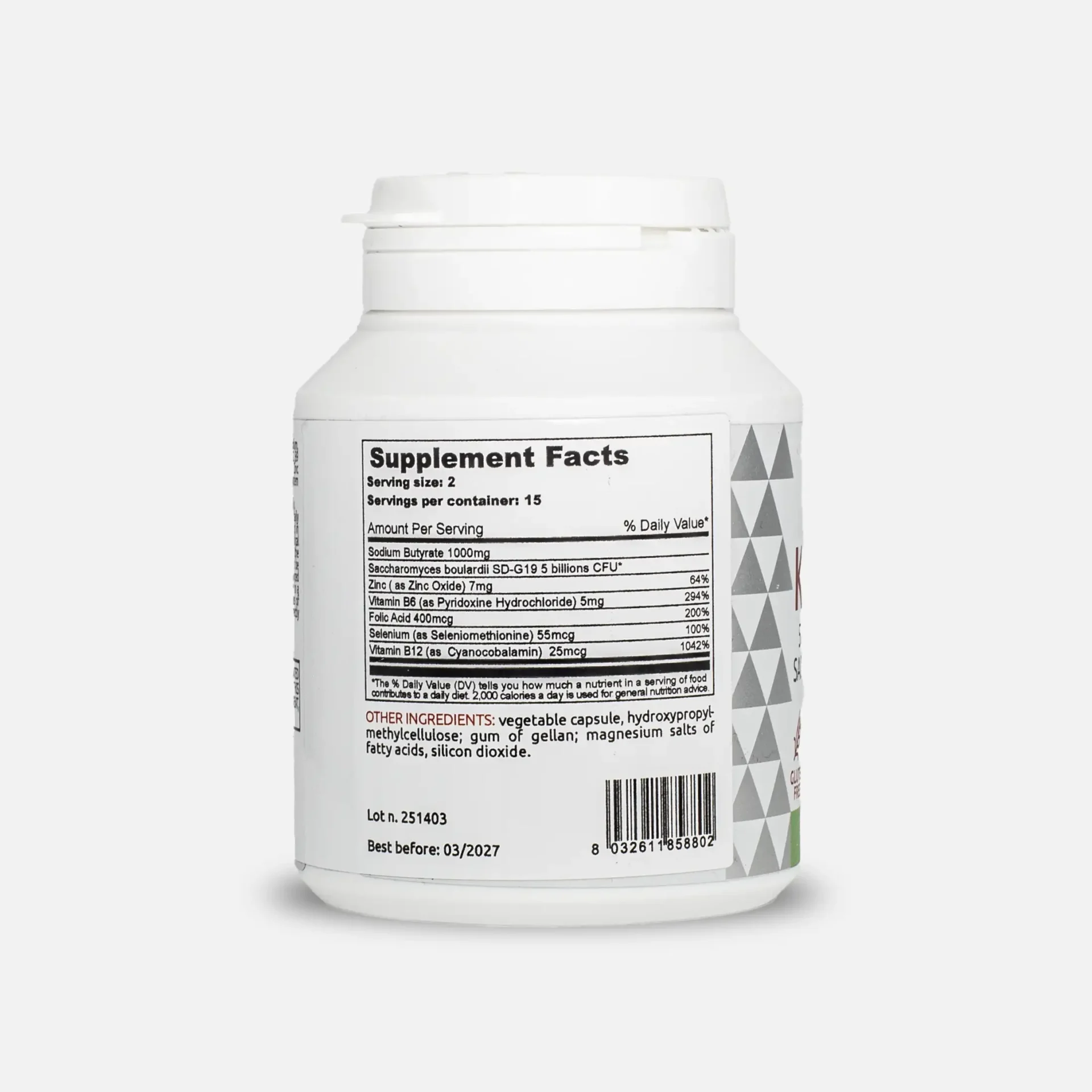Sodium butyrate; Saccharomyces boulardii SD-G19; vegetable capsule (coating agent: hydroxypropyl methylcellulose, stabilizer: gellan gum); anti-caking agents: magnesium salts of fatty acids, silicon dioxide; zinc oxide; vitamin B6 (pyridoxine hydrochloride); folate (pteroil-monoglutamic acid); vitamin B12 (cyanocobalamin); L-selenomethionine.