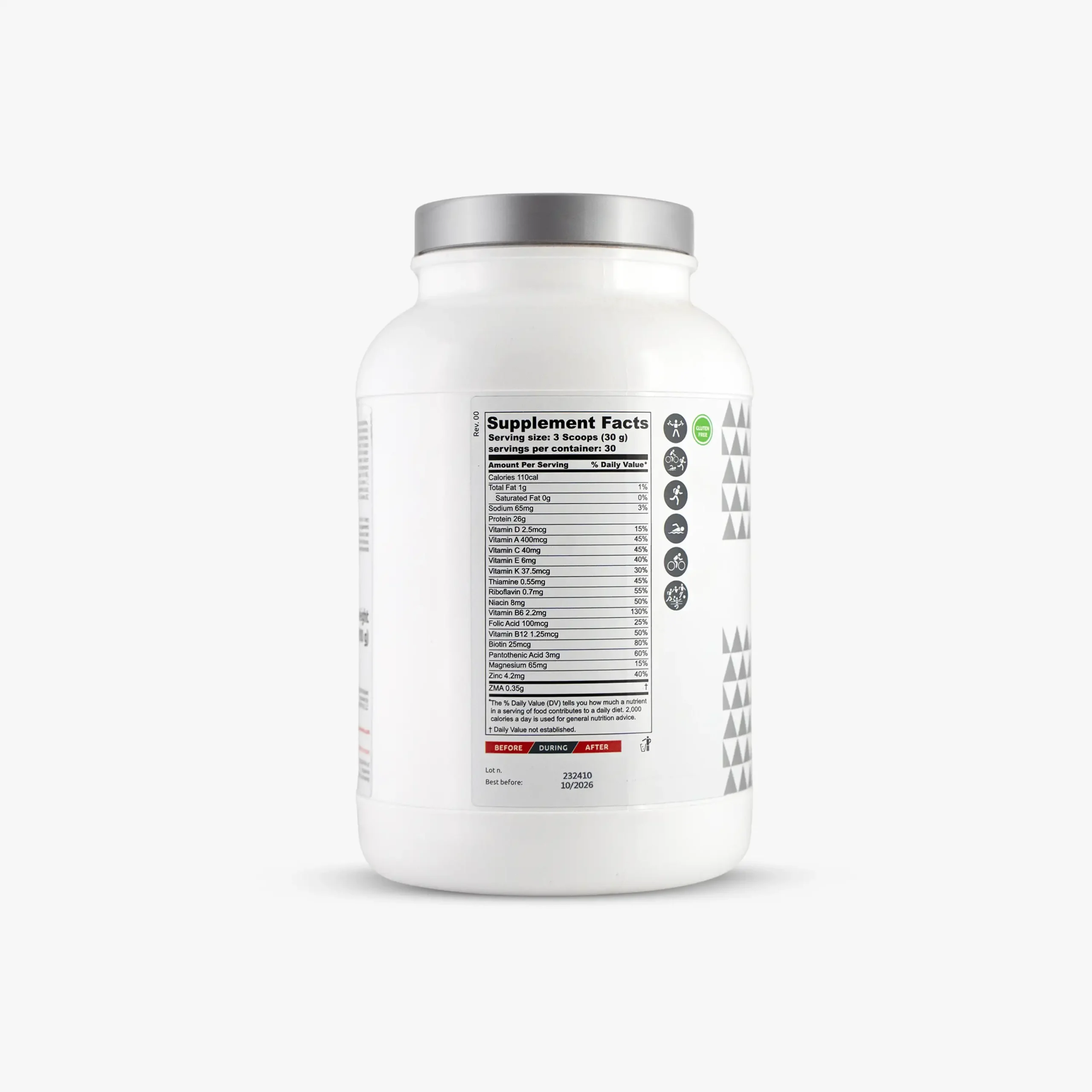 Whey Protein (contains emulsifier: soy lecithin), cocoa powder, anti-caking agent: silicon dioxide, maltodextrin, ZMA® (magnesium citrate, magnesium oxide, zinc mono-L-methionine sulfate, zinc aspartate, pyridoxine hydrochloride (Vitamin B6)), emulsifier: sunflower lecithin, flavoring, maltodextrin, vitamin C (L-ascorbic acid, stabilizer: ethyl cellulose), sweeteners:sucralose, vitamin E (DL-alpha-tocopheryl acetate), niacin (nicotinamide), pantothenic acid (calcium D-pantothenate), vitamin A (retinyl acetate), vitamin D (cholecalciferol), vitamin B6 (pyridoxine hydrochloride), vitamin K (phylloquinone), vitamin B1 (thiamine hydrochloride), vitamin B2 (riboflavin), folic acid (pteroyl-monoglutamic acid), D-biotin, vitamin B12 (cyanocobalamin).