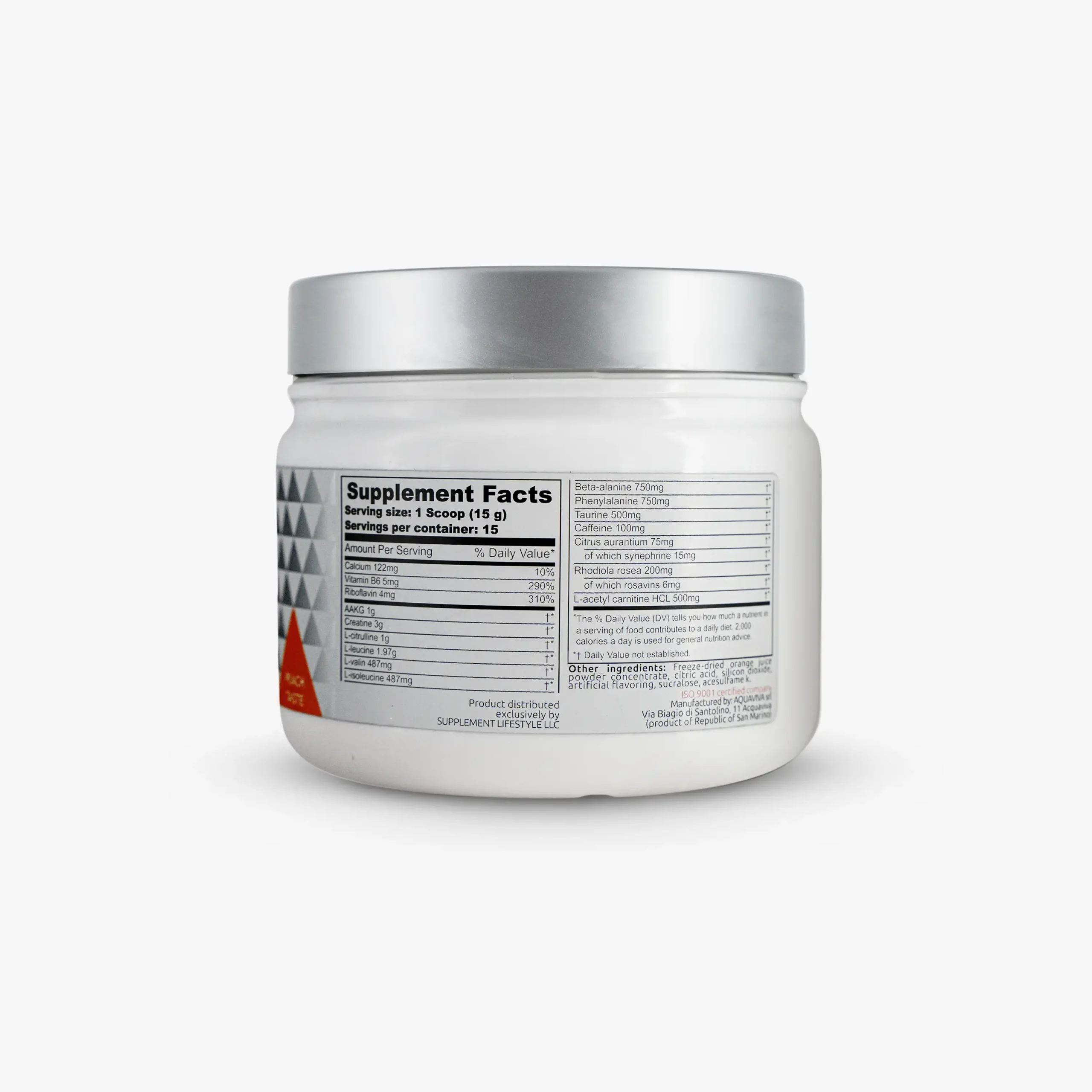 Monohydrate creatine, freeze-dried concentrated orange juice powder, BCAAs (L-leucine, L-isoleucine, L-valine), L-leucine, alpha-ketoglutarate arginine (AAKG), L-citrulline, beta-alanine, phenylalanine, calcium lactate, acetyl L-carnitine hydrochloride, taurine, acidifier: citric acid, Rhodiola rosea (Rhodiola rosea L., root) extract standardized to 3% rosavins, caffeine, anti-caking agent: silicon dioxide, bitter orange (Citrus aurantium var. amara L., immature fruit) extract standardized to 20% synephrine, flavor, sweeteners: sucralose, acesulfame k; pyridoxine hydrochloride (vitamin B6), riboflavin (vitamin B2)