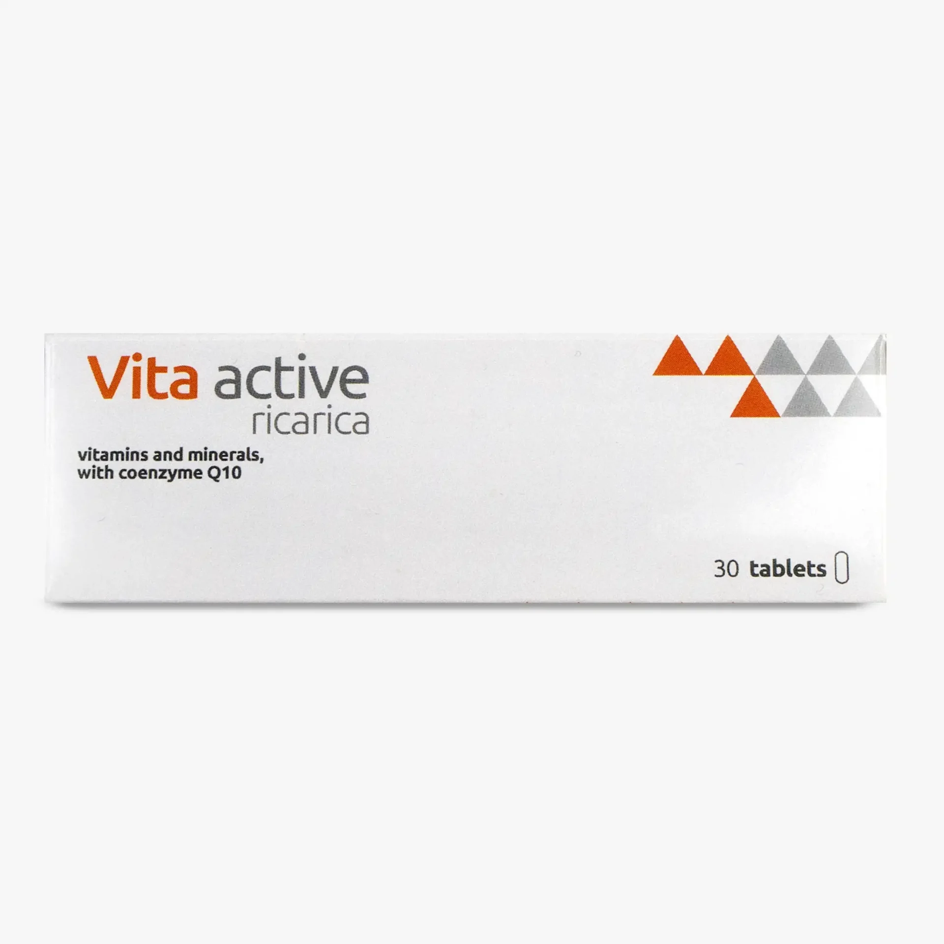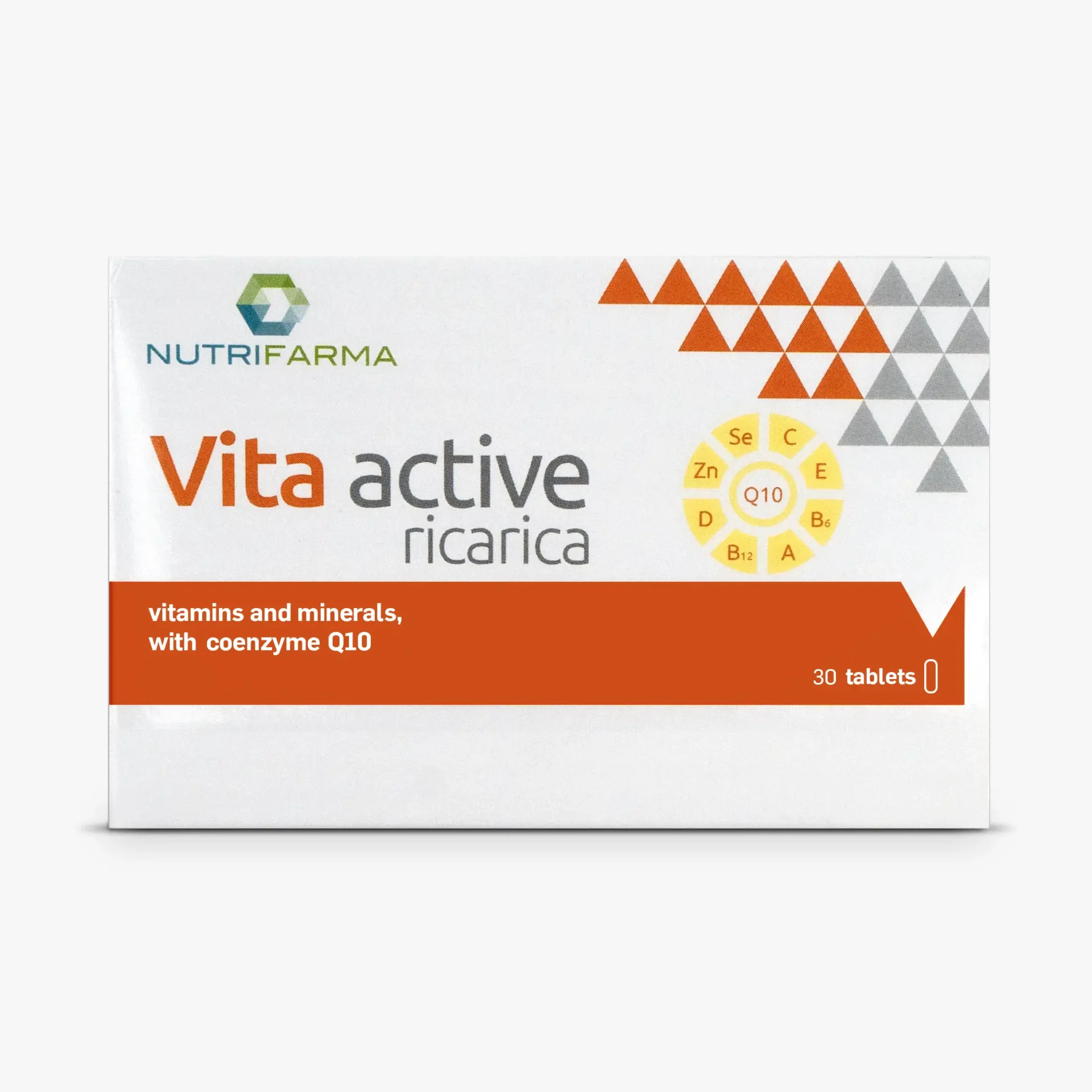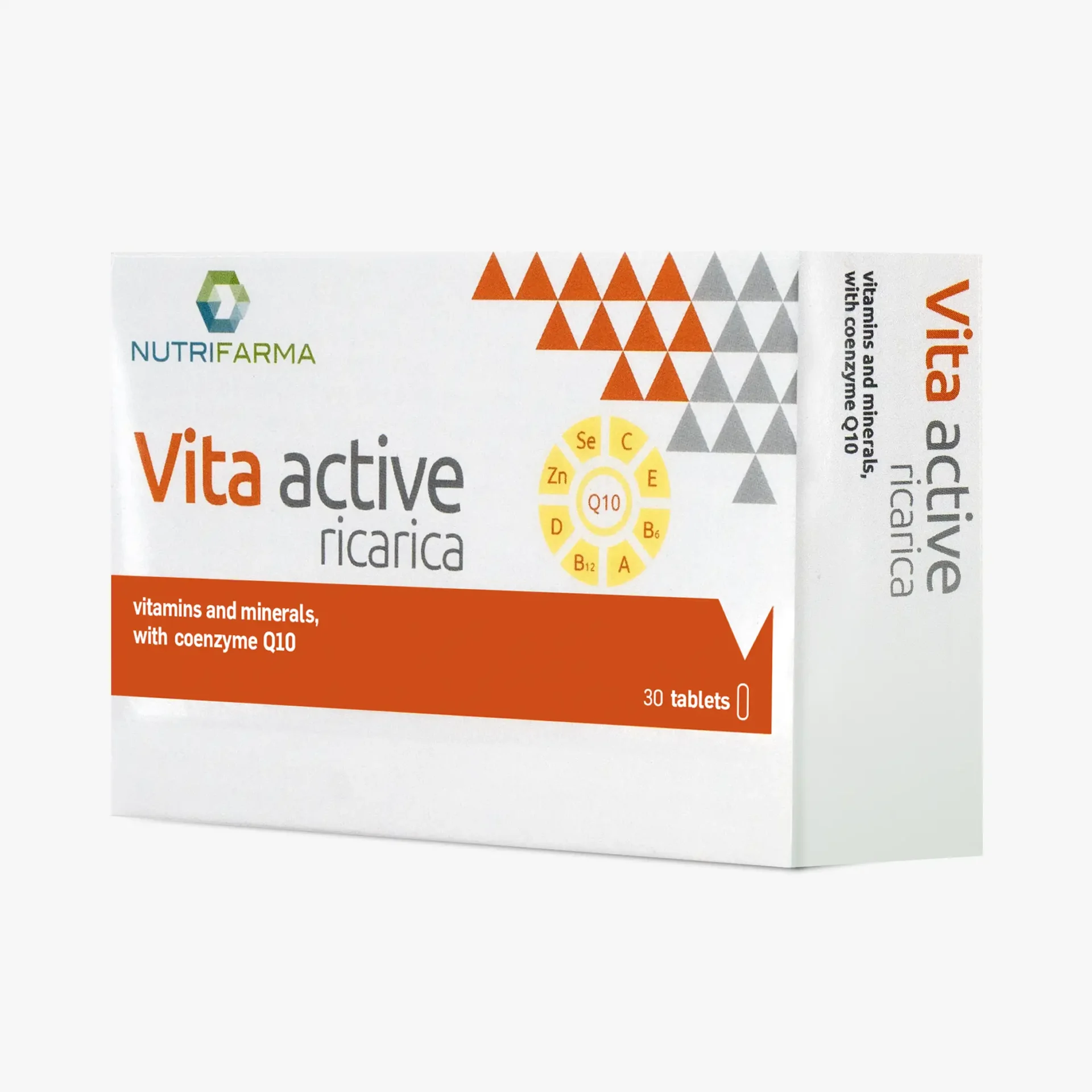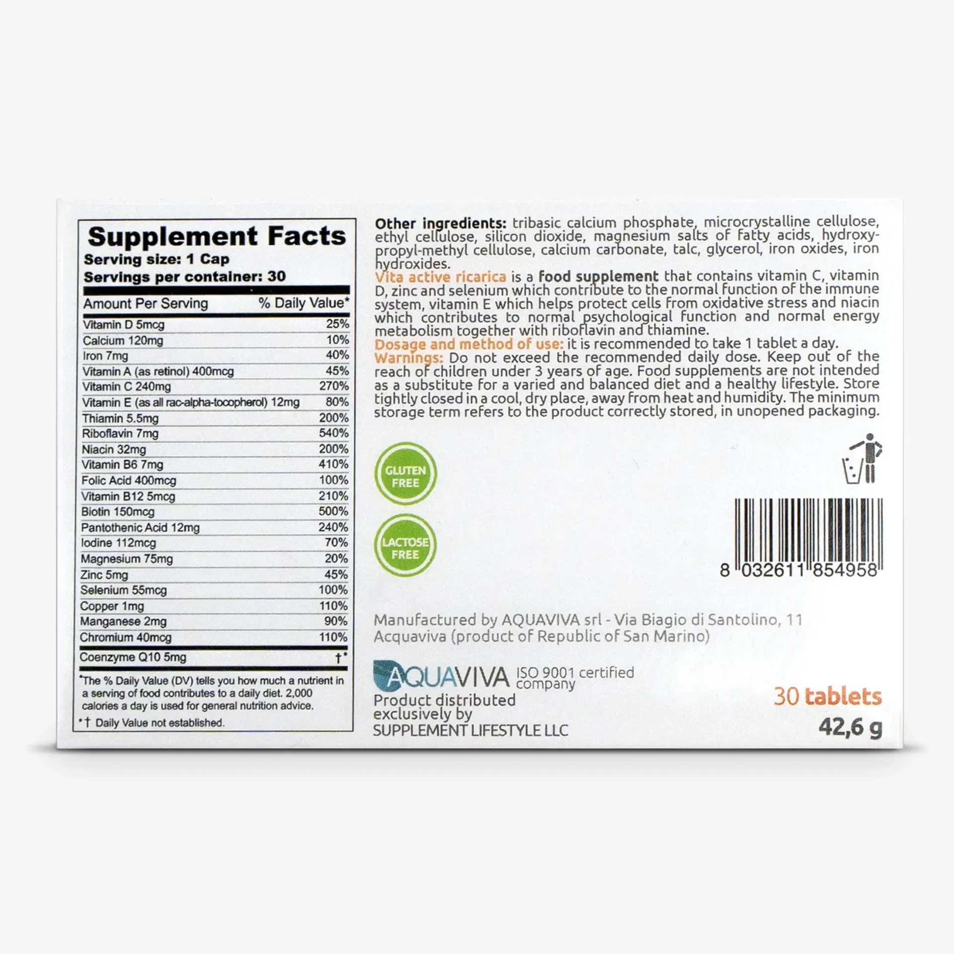 Bulking agents: tribasic calcium phosphate, microcrystalline cellulose, vitamin C (L-ascorbic acid, stabilizer: ethyl cellulose), magnesium oxide, magnesium carbonate, L-calcium ascorbate, zinc gluconate, nicotinamide, vitamin E (DL-alpha-tocopheryl acetate), iron fumarate, manganese gluconate, pantothenic acid (calcium D-pantothenate), L-selenomethionine, vitamin B6 (pyridoxine hydrochloride), copper gluconate, vitamin B2 (riboflavin), coenzyme Q10, vitamin B1 (thiamine hydrochloride), anti-caking agents: silicon dioxide and magnesium salts of fatty acids, vitamin A (retinyl palmitate), vitamin D3 (cholecalciferol), folic acid (pteroyl-monoglutamic acid), chromium picolinate, D-biotin, potassium iodide, vitamin B12 (cyanocobalamin), glazing agents: hydroxy-propyl-methylcellulose, calcium carbonate, talc, glycerol, iron oxides and hydroxides.